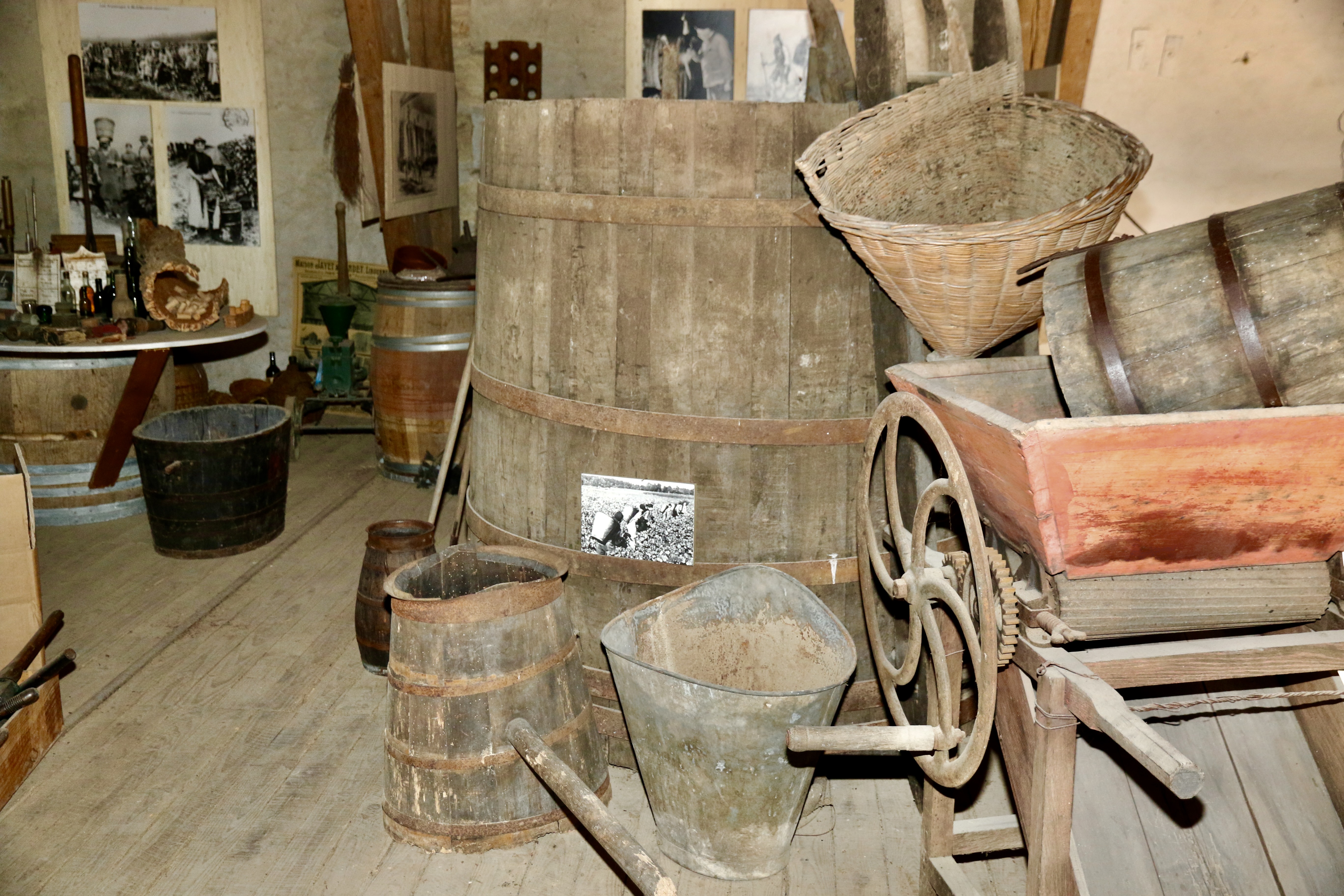 Mooi handgereedschap, oude rijtuigen, oogstmateriaal en toebehoren, essentieel voor een wijnboer uit die periode zijn verzameld, naast een woning uit de jaren dertig, bemeubeld en ingericht zoals destijds.